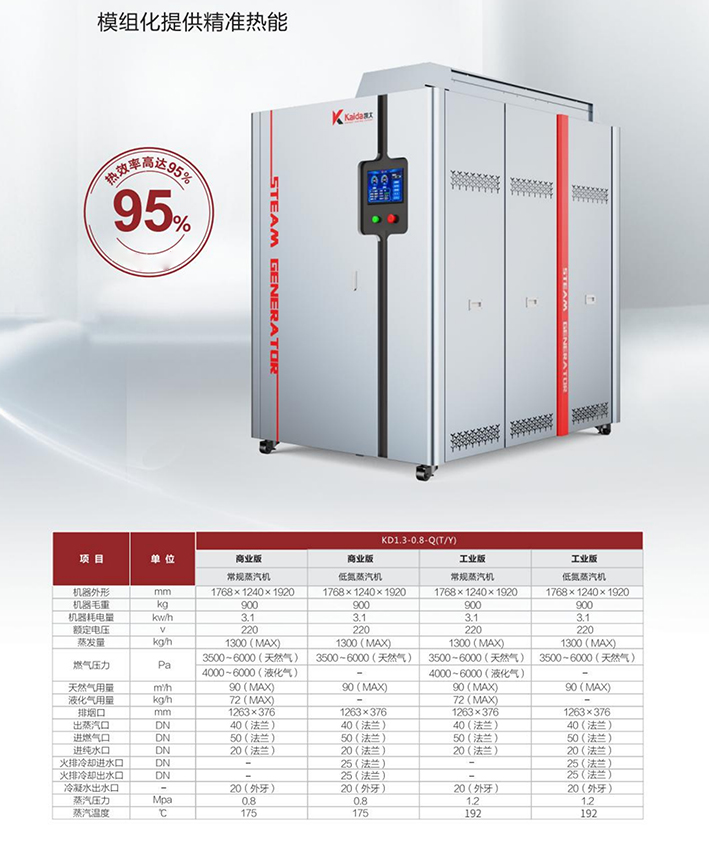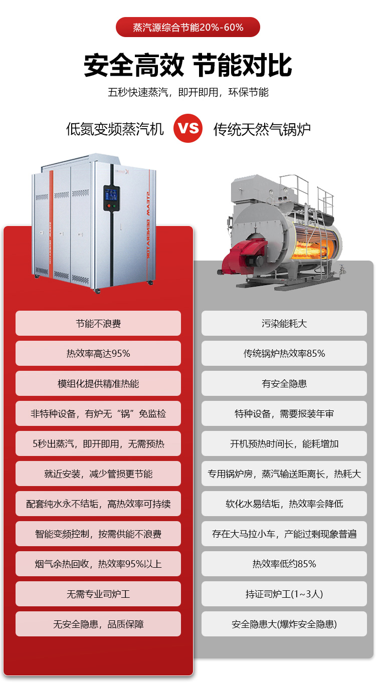 低氮變頻蒸汽機 非特種設備,有爐無“鍋”免監檢 5秒出蒸汽,即開即用,無需預熱 就近安裝,減少管損更節能 配套純水永不結垢,高熱效率可持續 智能變頻控制,按需供能不浪費 煙氣余熱回收,熱效率95%以上 無需專業司爐工 無安全隱患,品質保障