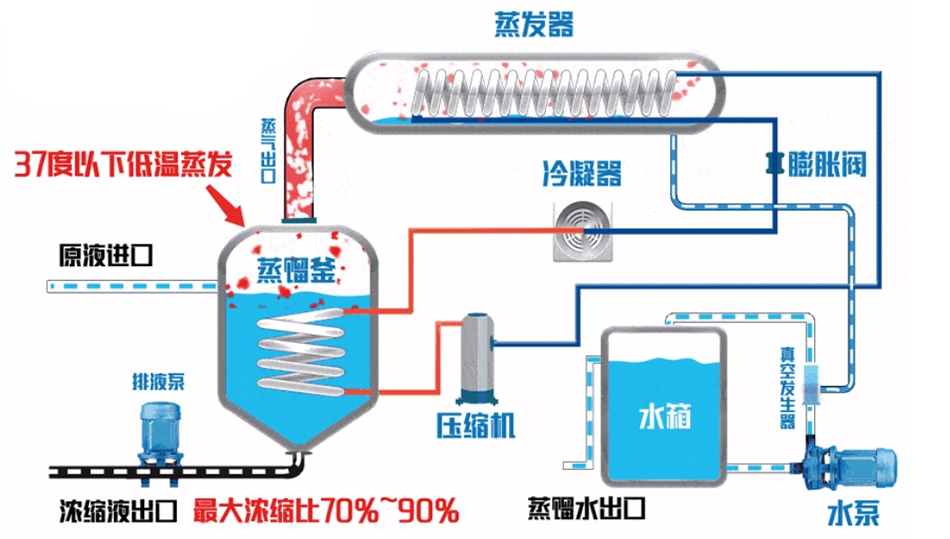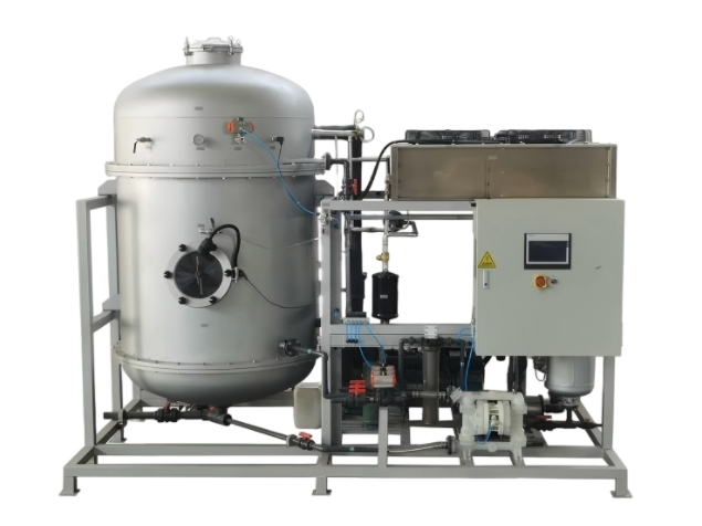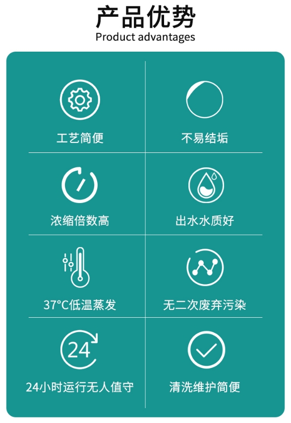1真空度保持約為-97Kpa,蒸發溫度保持35°-37° 2沸騰室采用316/2205不銹鋼或鈦合金材質 3控制系統采用西門子PLC和控制面板 4可處理腐蝕性廢液,濃縮比最高可達6%