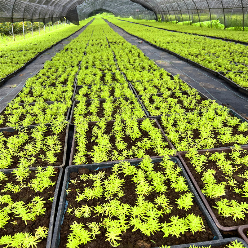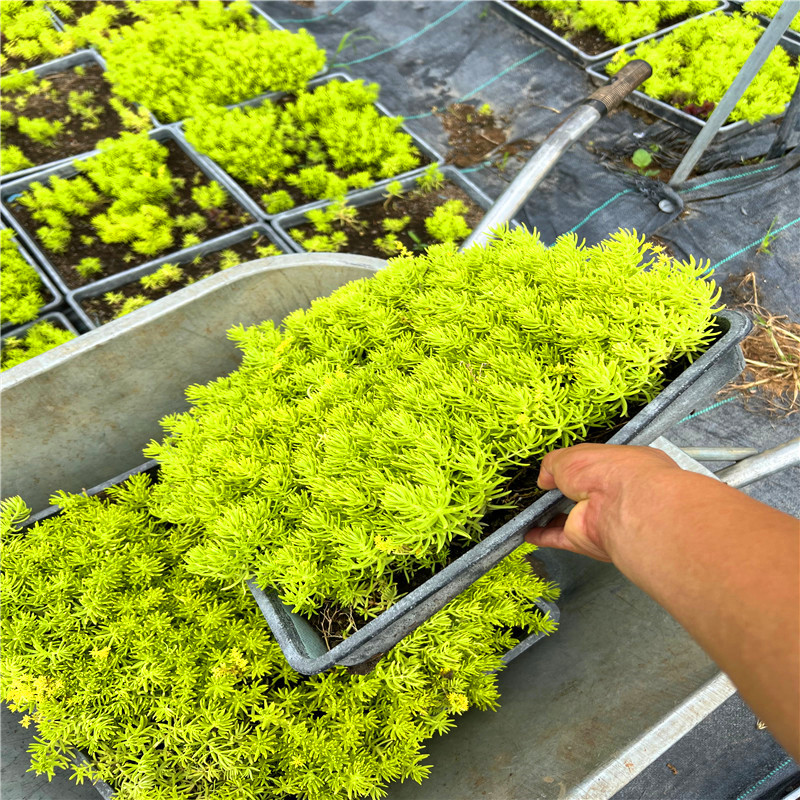 供應金葉佛甲草方盆苗,托盤苗,金葉佛甲草的葉片顏色為金黃色,高度在10-20公分左右,繁殖速度非??欤梢哉f是落地生根,斷掉的莖葉到了地上就能夠生根。佛甲草多少錢一平方?佛甲草按40*40托盤來購買,一個平方需要6個托盤,一個托盤按照10元計算,是60-70元左右,也有佛甲草是按斤或者按株賣的,不過也是可以按平米賣的,大概一平米的佛甲草價格大約60~70元左右。買金葉佛甲草,還是找專業供應商,買的放心。